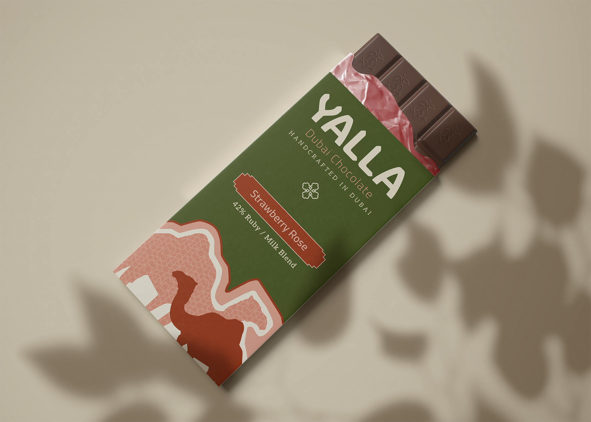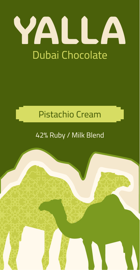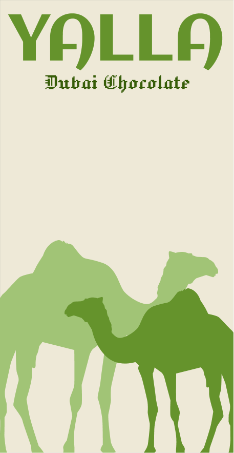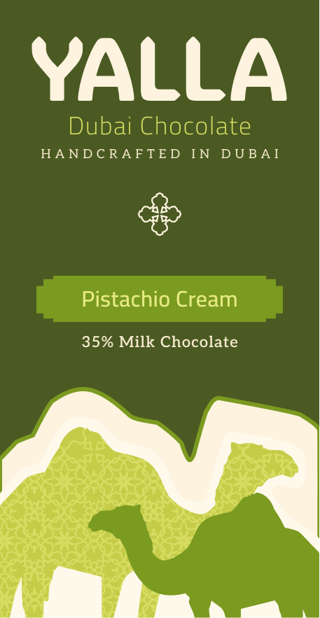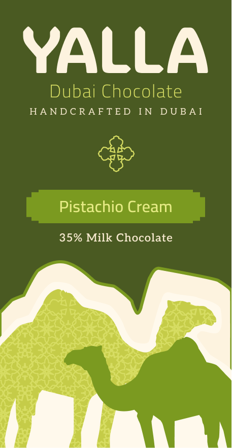 YALLA Dubai Chocolate is a concept brand inspired by Emirati culture, blending the richness of tradition with a modern, energetic twist. Positioned as a high-end yet approachable chocolate brand, YALLA captures the vibrant spirit of Dubai through bold colors, lively graphics, and playful storytelling. The name “Yalla,” meaning “let’s go!”, reinforces the brand’s dynamic, on-the-move personality: chocolate made for anyone savoring a moment of joy in motion.